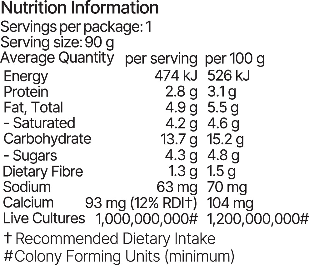 Oat and Rice Milk (78%) (Water, Oats, Rice Flour), Coconut (Cream, Oil, Berries (3%) (Boysenberry, Blueberry, Blackcurrant), Stabilisers (Corn Starch, Pectin), Plant Proteins (Faba Bean, Pea), Sugar, Clarified Pineapple Juice Concentrate, Mineral (Calcium), Natural Flavour, Salt, Live Cultures (incl. L. acidophilus, Bifidobacterium).